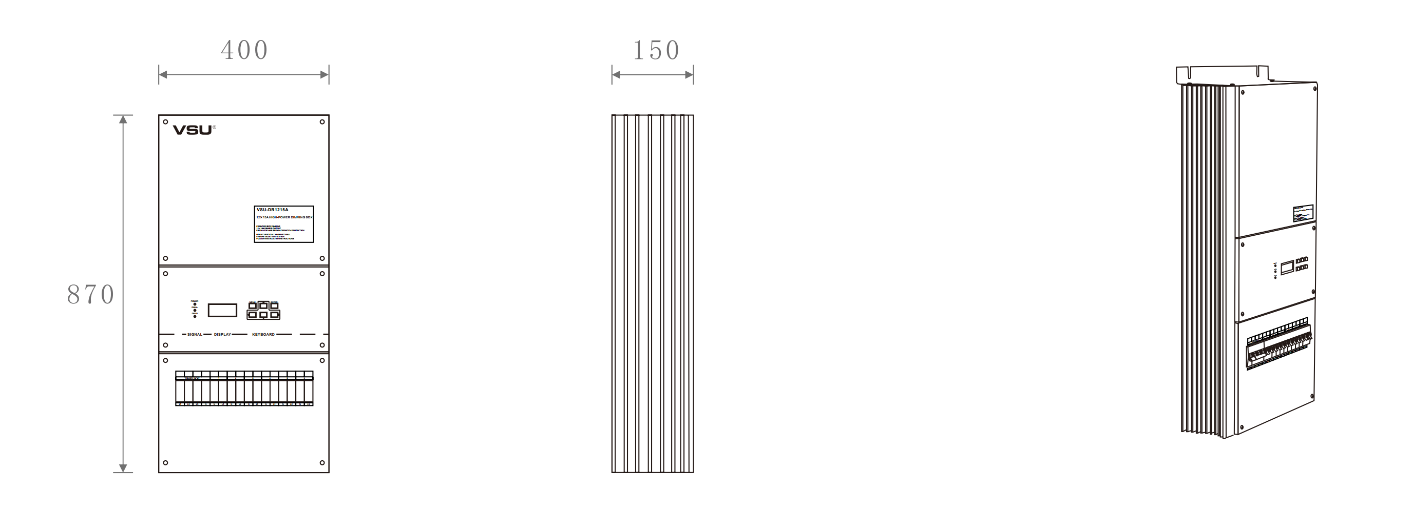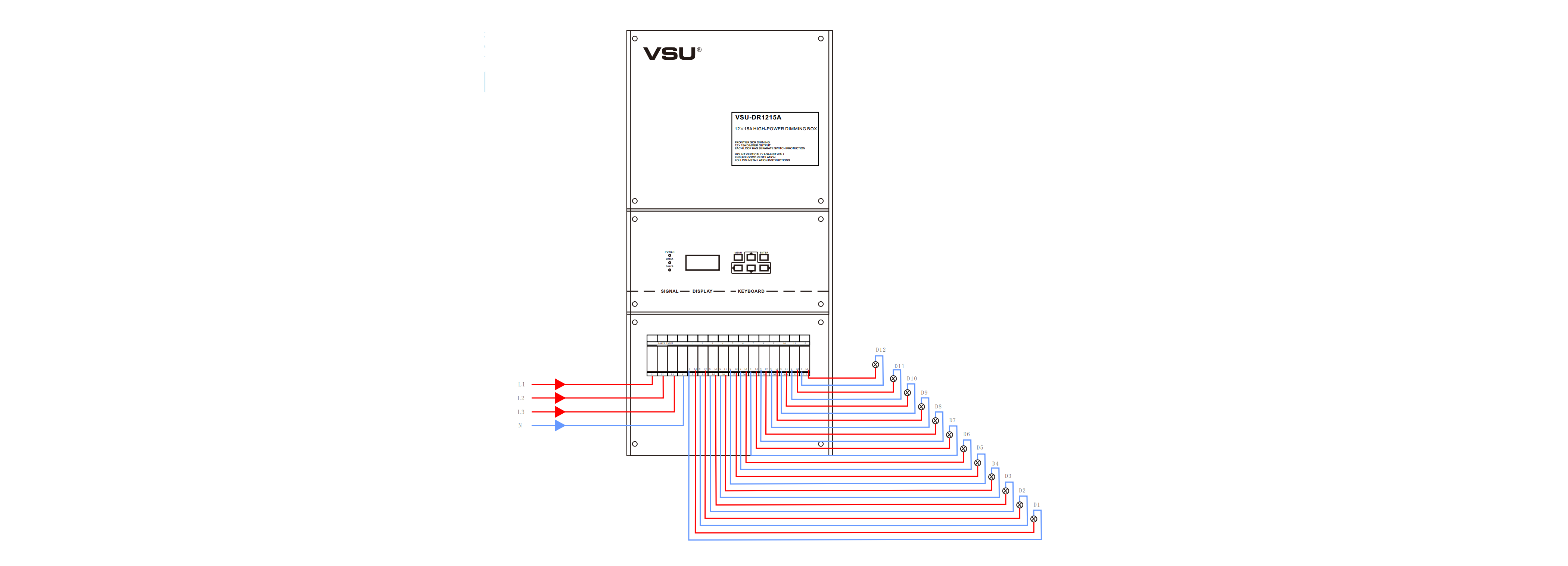 本產品為掛壁式安裝,前沿可控硅調光;12組調光通道輸出,每通道3200W;輕巧型設計美觀大方。帶斷路器保護; |