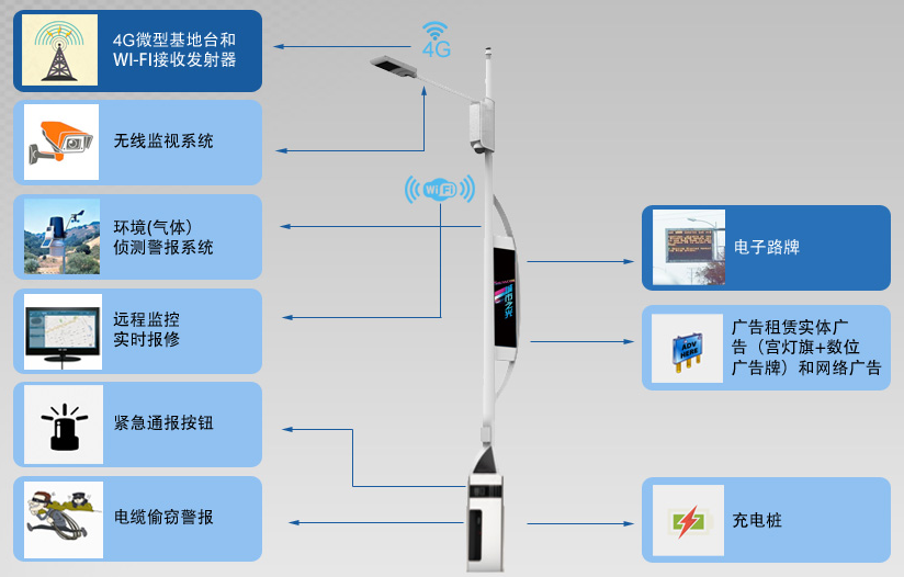 智慧路燈桿是一種集成各種信息設(shè)備技術(shù)創(chuàng)新復(fù)合應(yīng)用的智慧路燈產(chǎn)品,整個(gè)智慧燈桿內(nèi)包含路燈照明控制系統(tǒng)、WIFI天線基站、視頻監(jiān)控管理、廣告屏播控系統(tǒng)、城市環(huán)境實(shí)時(shí)監(jiān)測(cè)、緊急呼叫系統(tǒng)、水位監(jiān)測(cè)、充電樁系統(tǒng)和井蓋監(jiān)測(cè)系統(tǒng)等應(yīng)用。
